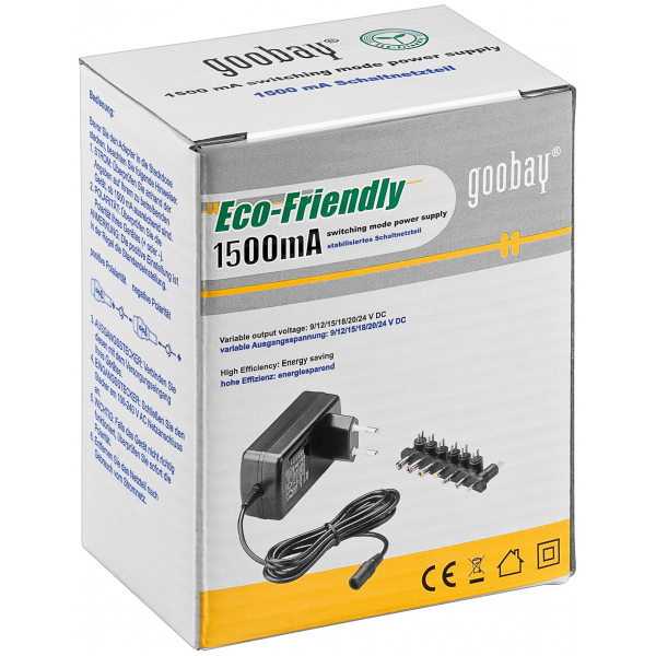 Alimentation universelle AC/DC 9-24V, permet d'alimenter tout appareil consommant jusqu'à 1500mA • TENSIONS SECTEUR: 100-240V AC • TENSIONS: 9V, 12V, 15V, 18V, 20V, 24V DC • Intensité Max de 1500mA • 7 prises différentes incluses. • Polarité ajustable • Câble de 1,75 mètres • Conforme à l'European Ecodesign Directive 2005/32/EC (EuP)